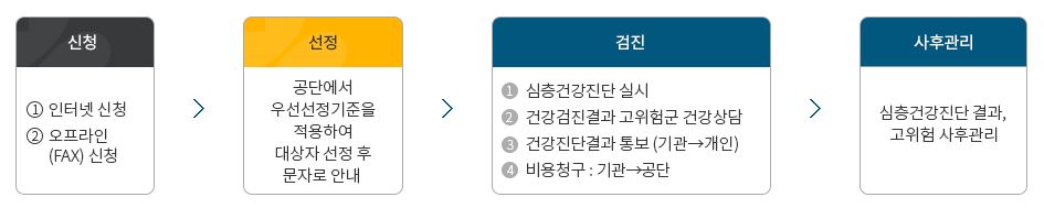 ■ 뇌심혈관질환 발병률이 높은 고위험(야간, 장시간, 고령 등) 노동자에게 뇌심혈관계에 특화된 건강진당을 지원하여서 질병들을 조기에 발견하고, 집중관리를 통해 사망으로 이환되는 자들을 방지하기 위한 복지 서비스입니다.