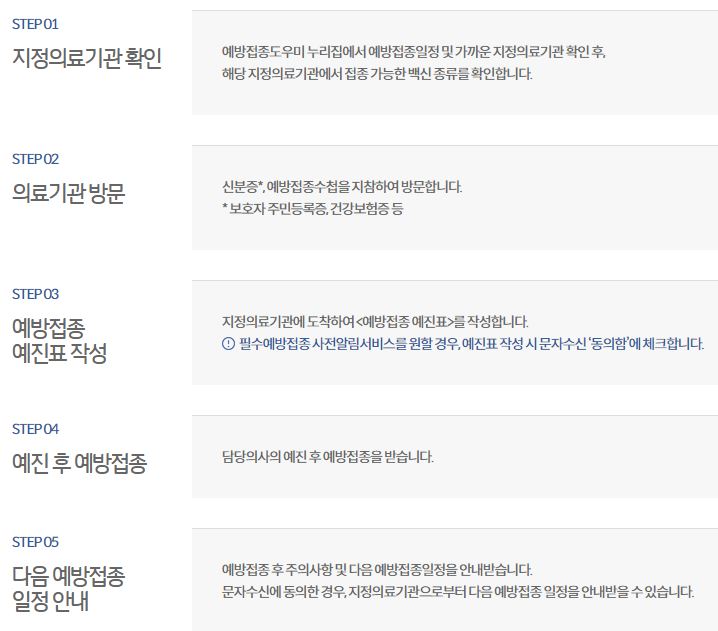 ※ BCG(피내용), HepB(B형 간염), DTaP(디프테리아·파상품·백일해·폴리오·b형헤모필루스인플루엔자), Hib(b형헤모필루스인플루엔자), PCV(폐렴구균), MMR(홍역· 유행성 이하선염·풍진), VAR(수두), IJEV(일본뇌염 불활성화 백신), LJEV(일본뇌염 생독화 생백신), HepA(A형간염), HPV(사람유두종바이러스 간염증),IIV(인플루엔자), RV(로타바이러스)